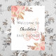 A welcome poster for a Baby Shower, celebrating a baby girl. A white background decorated with pink roses, florals, pampas grass and a large butterfly. Personalize and add a name.