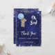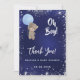 En blå bakgrund. Den blå färg är ojämn. En nalle med blå ballong och faux silver glitter. Anpassa och lägg till namn och ett datum på framsidan. Namn och texten: Oh Boy! är skrivna med ett handskript stil Tillbaka: Tackkort och namn