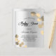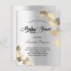 En modern, elegant könsneutral inbjudan till baby shower. Falsk silvermetallisk bakgrund dekorerad med gyllene eukalyptus kvistar. Personifiera och lägg till ett namn och festdetaljer. Svarta bokstäver.
