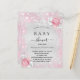 En modern, elegant baby shower som firar en babyflicka. Falskt silver metalliskt utseende bakgrund dekorerad med rosa falskt glitter, gnistrande och blommor. Anpassa och lägg till ett namn och festdetaljer. Svarta bokstäver.