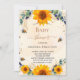 En vit och guldfärgad bakgrund som dekoreras med solblommor, humla, eukalyptus grey, guldfärgade löv och faux glitter damm från guld. Anpassa och lägg till information om namn och party.