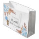För en boho, bohemian stil Baby Shower. En vit bakgrund. Dekorerad med ljusblå blommigtar, pampasgräs och en nalle med blå ballong. Anpassa och lägg till ett datum, namn.