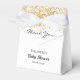 En snyggt vit bakgrund med faux guld konetti. Med texten: Baby Shower och Tack skriven med ett modernt handskript i stil. Anpassa och lägg till ett namn och ett datum.