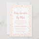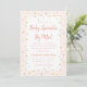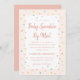 En vit baby sprinklar med e-postinbjudan med regnbågssprinkler gräns på rosa.