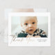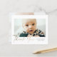 Budgetera Guld Script Baby Photo tackto You Card. Baksidan innehåller ett meddelande från familjen och ett andra foto. Klicka på knappen Redigera om du vill anpassa designen med foton och detaljer.