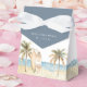 Utformningen visar mjukt målade handflatan-träd, sandstrand, havsyta vinkara och ett par surfbrädor, täckta med en dammig blå flagga och bundna med ett skarpt vitt band. De här lådorna är idealiska för tropiska duschar, surfor eller strandburna duschar och är perfekter för att hålla godis, kakor eller små gåvor och parar vackert med motsvarande kuststationsviten för ett sammanhängande utseende.