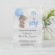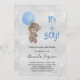 För en babydusch som firar en pojke. En faux silver tittar bakgrund. En nalle med blå ballong. Anpassa och lägg till närmare uppgifter om namn i mamma och party. Namn och texten: Det är en pojke! är skrivet med ett handskript i stil