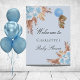En välkommen poster för en elegant och modern babydusch. En ljusblå bakgrund, boho stil pampas-gräs, ljusblå blommigtar och en nalle pojke som håller en blå ballong. Anpassa och lägg till ett namn.