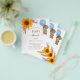 För en modern boho stil babydusch. En vit bakgrund. Dekorerad med solblommor, pampasgräs och en nalle pojke med blåballong. Anpassa och lägg till information om namn och party. Bakåt: ljusblå bakgrund.