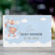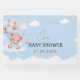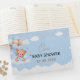 Björnskabb För en elegant babydusch en fin design med ljusblå bakgrund, dekorerad med ljusblå och bruna ballonger, moln och söt nalle för att fira pojke. Du kan lägga till namn och datum.
