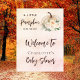 En välkommen poster för en elegant och modern babydusch. En rosa- och ro guld-gradientbakgrund, en gräddpumpare och blommor av färgad. Text: En liten Pumkin är på väg. Välkommen till. Brun text.