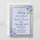 Blåblått Silver-miniatyrbildsblått blommigt Babybildsinbjudan Utformningen har ljus och mörk vattenfärgsbuketter i marin blommigt på ljusblå och silver grått glitter-miniatyrbakgrund.