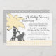 Roligt liten apa och handflatan träd-babyduschinbjudan med i grått och gult gingham check mönster.