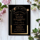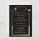Mystical Black Guld Måne Stars Baby Shower Celestial Gender Reveal Baby Shower är en ram från guld sol, måne och stjärnor på en svart bakgrund med dina menydetaljer i mitten i det moderna Sol kalligrafiskript. Inuti är din anpassningsbar babydusch och gender avslöjar inbjudningsinformation. Anpassa genom att redigera texten i textrutorna. Designad för dig ©2022 Evco Studio www.zazzle.com/store/evcostudio