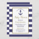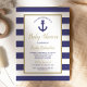 Den här inbjudan till marinbabyduschen innehåller ett marinblått ankare och en bakgrund av marinblått och vitt rand. Ord "Baby Shower", namn i mor som ska visas, och OSA deadline visas i skripttypografi av guld-färgad. Den återstående texten är i marint blått. Idealisk för en pojkdusch!