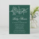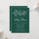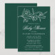 Elegant blommigt-babyduschinbjudningar med vita skissade blommor och löv nära överdelen av inbjudan med mörk grönt bakgrund. Anpassa den botaniska babyduschinbjudan med mor namn och duschdetaljer nedan i klassiskt vitt brev.