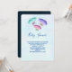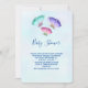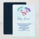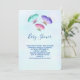 Babyduschfest med söt. 3 vattenfärgsmusslor, målad rosa, lila och grönt. En ljusblå vattenfärgsbakgrund med ljusa rosa tips.
