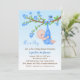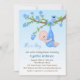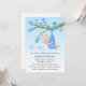 En söt inbjudan till baby shower för en pojke med en söt bebis i en blå filt bunden till en trädgren med blå hjärtformade blad och en liten uggla. Skapad med originalkonst av delightful-doodles.