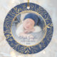 Grattis till baby, första julen med denna vackra keepéprydnad. Byt enkelt ut exempelbilden mot ditt eget favoritfoto och anpassa den med baby namn i marint blått skript och året nedan. Med en vit övertoning skärm kan du göra så att texten visas. Fotot avges av en elegant runt ram som är dekorerad med handritad folie av guld på en marin blå bakgrund.