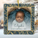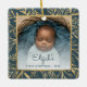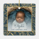 Grattis till baby, första julen med denna vackra keepéprydnad. Byt enkelt ut exempelbilden mot ditt eget favoritfoto och anpassa den med baby namn i färgblått skript och året nedan. Med en vit övertoning skärm kan du göra så att texten visas. Fotot avges av en elegant kvadrat ram, som dekoreras med en handritad foliefolie i guld på en tealblå bakgrund.