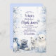 Winter ONEderland First Birthday Invitation Card with Arctic Animals and Frozen Leaves in Blue Colors.