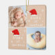Baby's First jul 2 Photos Santa Hat Snowflake Beige Ceramic Ornament. Cute baby första juldesign med en röd julhatt, snöflingor, ett baby namn i ett vitt skript med ett baby-foto - personliggör med namn och foton från baby.
