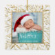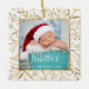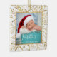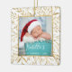 Grattis till baby, första julen med denna vackra keepéprydnad. Byt enkelt ut exempelbilden mot ditt eget favoritfoto och anpassa den med baby namn i vitt handskriftsteckensnitt och året nedan. (Utformningen fungerar bäst med foton som har mörkens bakgrund i det nedre området.) Fotot ramas in av en elegant kvadratisk ram som är dekorerad med handritad barrträd i guld på vit bakgrund.