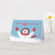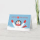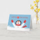 Ett snögubbe närmar sig med glädje snö. Perfekt kort att skicka på baby:s första jul! Snögubbe är uppbundet i röda vinklar och halsduk.