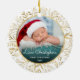 Grattis till baby, första julen med denna vackra keepéprydnad. Byt enkelt ut exempelbilden mot ditt eget favoritfoto och anpassa den med baby namn i vitt skriptteckensnitt och året nedan. Med en svart övertoning skärm kan du göra så att texten visas. Fotot avges av en elegant runt ram, som dekoreras med handritad fotfolie från guld på vit bakgrund.