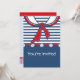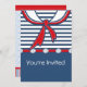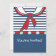 Frakter ahoy för en nyfödd bebispojke med denna förtjusande design. Marinen och vitsjömankostymen med rött och vit förser med krage och tien, och gulligt knäppas. Anpassadetext. Baby showerinbjudningar, tacka dig vykort, knäppas, minnessakprydnadar, klistermärkear och mer! PinkInkArt original.