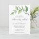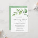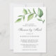 Rustic Baby Shower by Mail-inbjudan när du inte kan träffas personligen. Den här inbjudan innehåller en enkel design med en vattenfärg som målats i grön ton med stora löv, över en vit bakgrund. Nedan visas händelseinformationen i ett mjukt grått och baksidan har en ljust grönt vattenfärg tvättat. Denna botaniska elegant är könsneutral och fungerar för en pojke eller flicka.