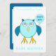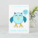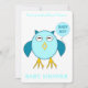 Den här inbjudan till fantastisk Baby Shower har en söt tecknad av ett blått uggla med sömnig ögon, en bred beak och söta fluffa fjädrar. Uggla håller en pulverblå ballong. Det finns en blek blå text i ballongen som säger "Pojke". Det här är perfektens gåva för att fira ett nyfött pojke. Det finns anpassade på baksidan så att du kan anpassa inbjudan.