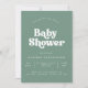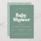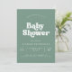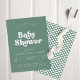 En inbjudan till trendigets babydusch med rubriken "babydusch" i vitt reflexteckensnitt på en muterad tealbakgrund. Anpassa med dina detaljer i teckensnittet vit sans serif. Baksidan har en polka punkt mönster i teal och vit.