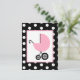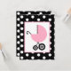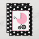 En flickduschinbjudan med en illustration av en rosa baby-vagn över en svart bakgrund med vitt polka dots. Anpassa texten på baksidan med information om tillfälle.