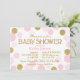 Guld glitter och rosa utspridda polkapunkter har en modern utformning av inbjudningskortet för barndusch.