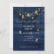 "Navy Twinkle Little Star Guld Boy Shower bjudan." En modern vattenfärg tvättar målad bakgrund i trä med guld glitter-stjärnorna och vit guld-glittrad text. På motsatt sida står mönster om en enda guldstjärna över samma marinbakgrund. Artist av internationellt licensierad konstnär och formgivare, Audrey Jeanne Roberts, upphovsrätt.