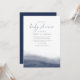 Elegantens inbjudan till babydusch vid kusten innehåller en ren marin blå vattenfärggradient längs grund med en graciös kurva som framkallar havsbotten och havsflödet. Din babyduschinformation visas i minimalistiska klassiska bokstäver med handskrivna skriptaccenter.