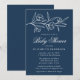 Elegant blommigt-babyduschinbjudningar med vita skissade blommor och löv nära överkanten av inbjudan med en marin bakgrund. Anpassa den botaniska babyduschinbjudan med mor namn och duschdetaljer nedan i klassiskt vitt brev.