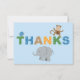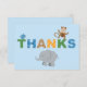 Kute djungelns djurvänner i baby, inklusive en fågel, elefant och apa, ram denna moderna och söta safari-temade babydusch tack vare ditt kort. Polka dot och rand mönster accents accents accents the "THANKS" text. Light himlar blue med grönt, blue, tan, orange, tan, brun och grått färg.