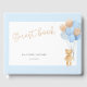 Välkomlig barndusch gäst bok, med en charmerande vattenfärg teckning i en uddigt nalle som håller blå, grått och bruna ballonger mot ljusblå bakgrund. Den här gästen bok är perfektens sätt att fånga minnen och önskemål från dina kära på denna speciella dag.