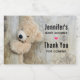 Barndusch eller andra evenemangsetiketter på flaska med ett foto av en söt stoppad björn, som står vid en rustik trävägg/baksida.