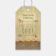 Märkre för bebisduschgåvor med söt vattenfärgspilar och fjädrar på en vacker brun och guld-bakgrund. De här märkrna för barnduschgåvor från stampilar är lätta att anpassa för din händelse.