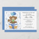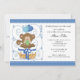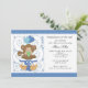Cute Monkey Pojke Shower-inbjudan. Konstruktionen har den kutaste pojke-apan i ett basket med blå bog och blå ballonger. Matchande frimärke och klistermärken i vår butik