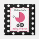 En babydusch med en illustration av ett rosa barnvagn över en svart bakgrund med vitt polka dots. Anpassa med ditt namn.