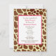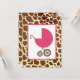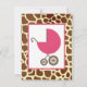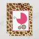 En inbjudan till babydusch med en illustration av en rosa baby-vagn över en bakgrund av girafftryck. Anpassa texten på baksidan med information om tillfälle.