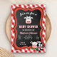 Akta dina gäster med den här söta babyduschen för kor i inbjudan, som innehåller vackra små kor med modern typografi mot en röd gingham-bakgrund. Lägg bara till din händelseinformation i den här mallen som är enkel att använda för att göra den till en inbjudan av typen en. Vänd över kortet för att visa en rustik lingved struktur på baksidan av kortet.