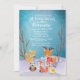 Rustiska vinterscenen med blå stjärnbakgrund, moderna vinterbabyduschtema för barn i bergsområden i party med trädjur: ekorre, räv, hjort, uggla och en fågel i snö. Det finns bruna kvistar på sidan. Perfekt för firande och babyduschar på vintern. Anpassa all party-information till anpassadet.