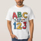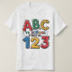 Bräckt och lekfullt T-shirt-design med stora, färgstarka brev och nummer (A, B, C, 1, 2, 3) som är ordnade i ett vismiskt mönster. Den roligt frasen "Back to school är enkelt som 123" är integrerad i utformningen och skapar denna perfekt för T-shirt för unga studenter, lärare och föräldrar tittar att fira skolårets början med ett sunt och undervisande stil