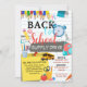 Back to school bash i slutet av sommaren party. Inbjudan har: pennor, skolväska, bokar, klocka, buss, äpple, papper bärbar dator, suddgummi, sax..Gör en underbar inbjudan att fira sommarens slut och starta det nya skolåret. Inbjudan arbetar underbart för klassrum, skola eller PTO/PTA-sponsrade skolevenemang i party! Börja skolåret med ett festligt och färgstarkt budskap.