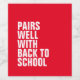 Vill du veta vad vin är bra på? Back to school. Allt går på superskojets anpassade vin-märke! Underbar för en rolig mamma-gåva eller till och med en lärarvänlig gåva. Den lustiga formuleringen är upp till dig eller så kan du lämna det som det är att läsa "parar bra med back to school". Den röda bakgrunden kan också justeras genom att klicka på "anpassa".